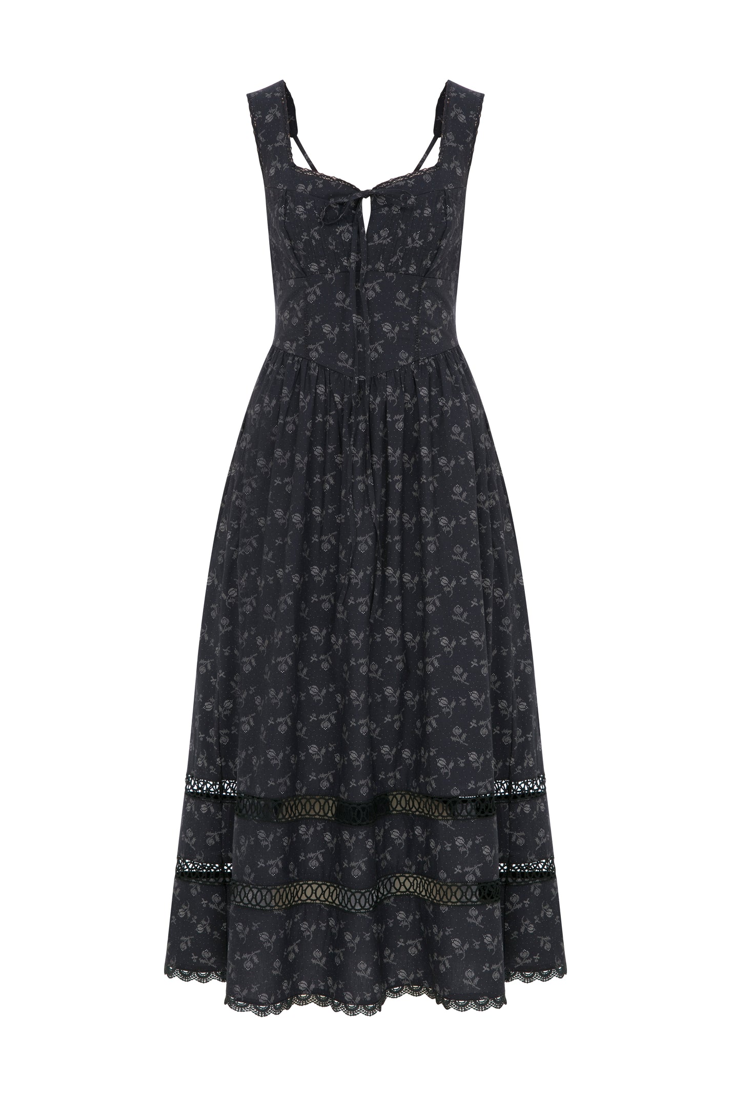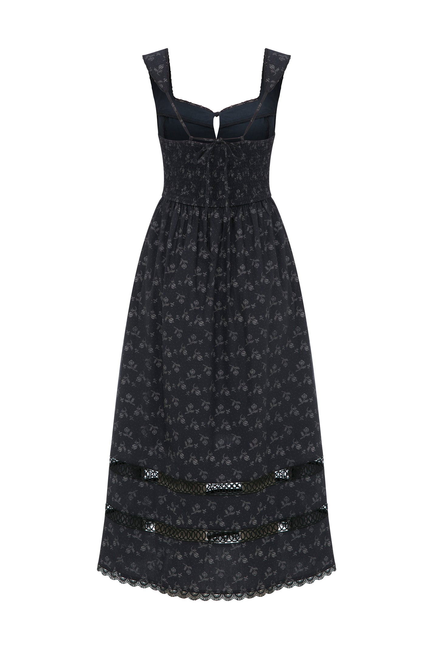 Delivery Month: March 2026 Pre-order deadline: 05.09.2025 / Crafted from crispy cotton with delicate lace trims, this dress features a structured bodice, subtle bow detail, and an all-over floral print. The smocked back ensures a flattering fit, while the full midi skirt adds a romantic, modern charm.