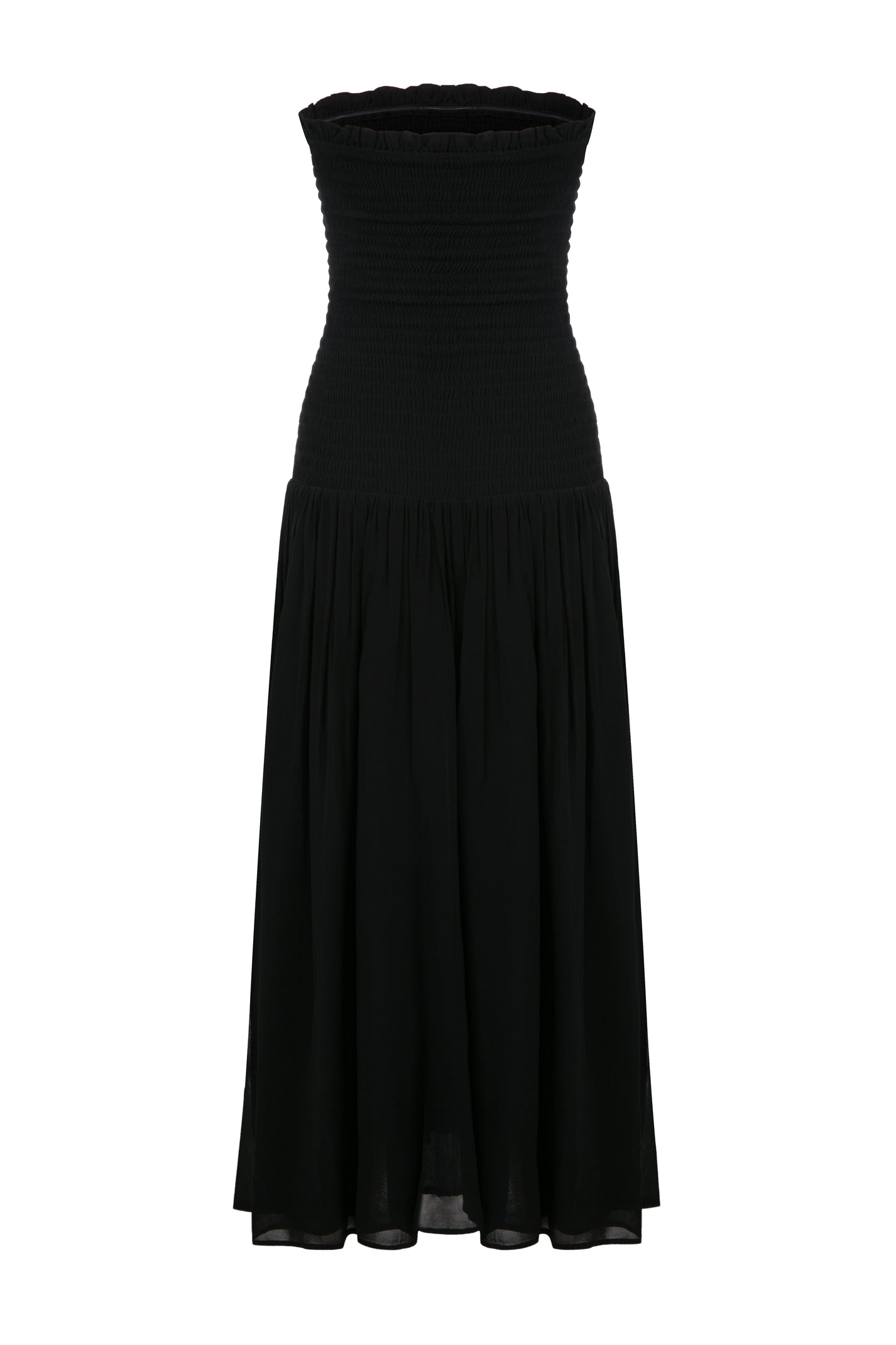 Strapless midi dress featuring a fully smocked bodice and a gathered, flowy skirt. Designed with a soft lining in the same quality as the shell fabric for a smooth, comfortable finish. Semi-sheer effect at the hem.