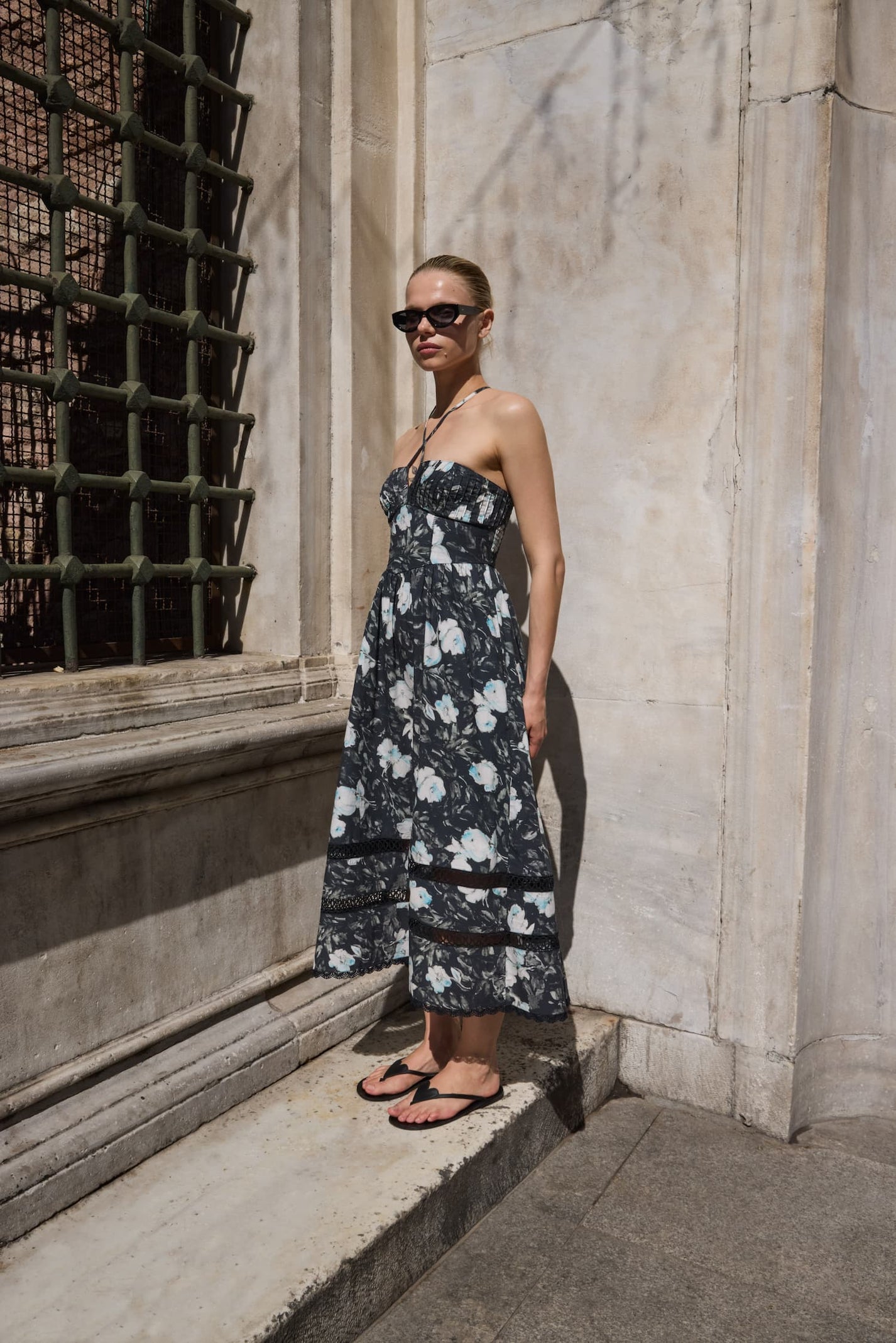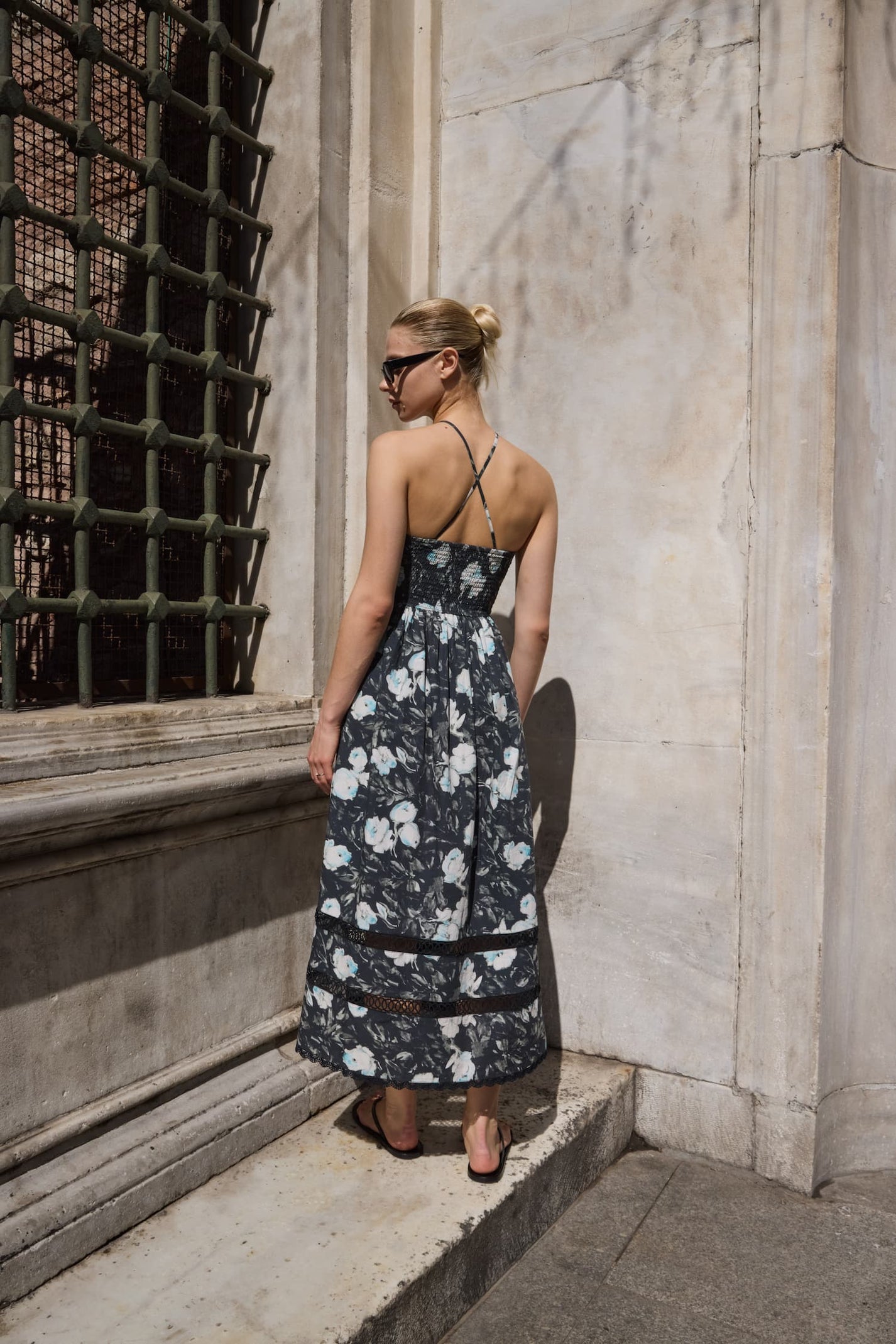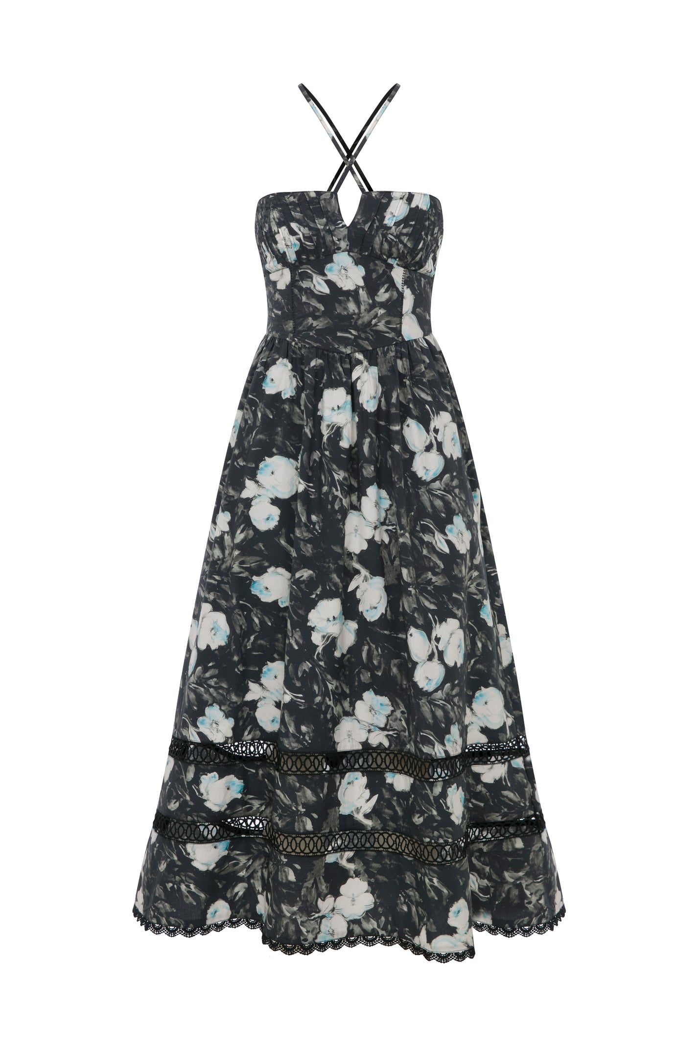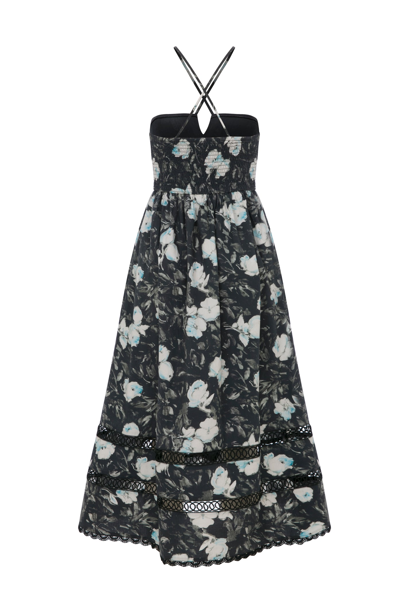 Delivery Month: March 2026 Pre-order deadline: 05.09.2025 / Sleeveless cotton dress featuring a painterly floral print, cross-back straps, and a ruched bodice for a flattering fit. Finished with delicate lace trims along the hem and skirt for a modern, romantic touch.
