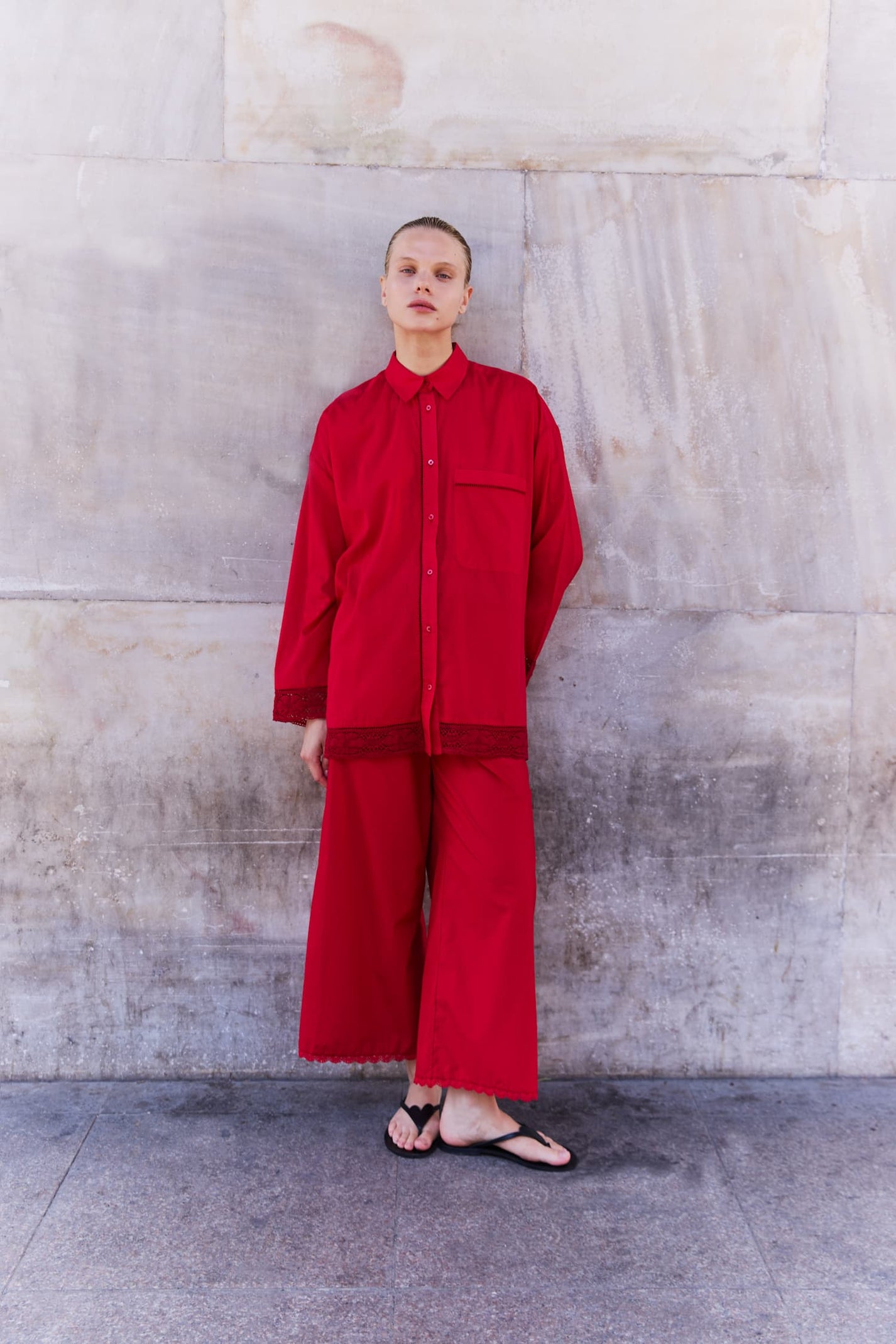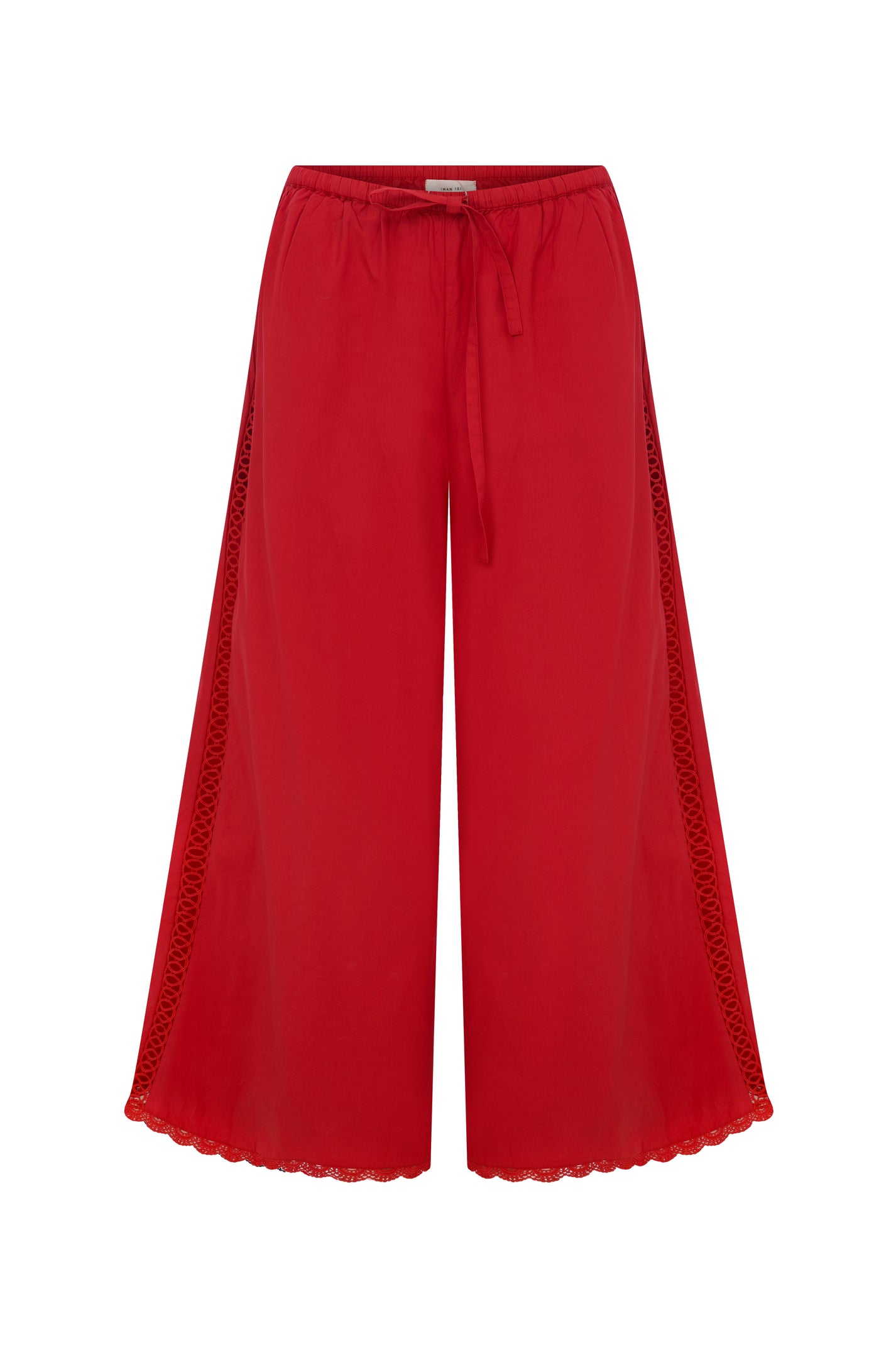 Delivery Month: March 2026 Pre-order deadline: 05.09.2025 / Wide-leg cotton voile pants with lace trim. Features lace-paneled sides, scallop-shaped lace at the hem, and an elastic drawstring waist for a relaxed fit.