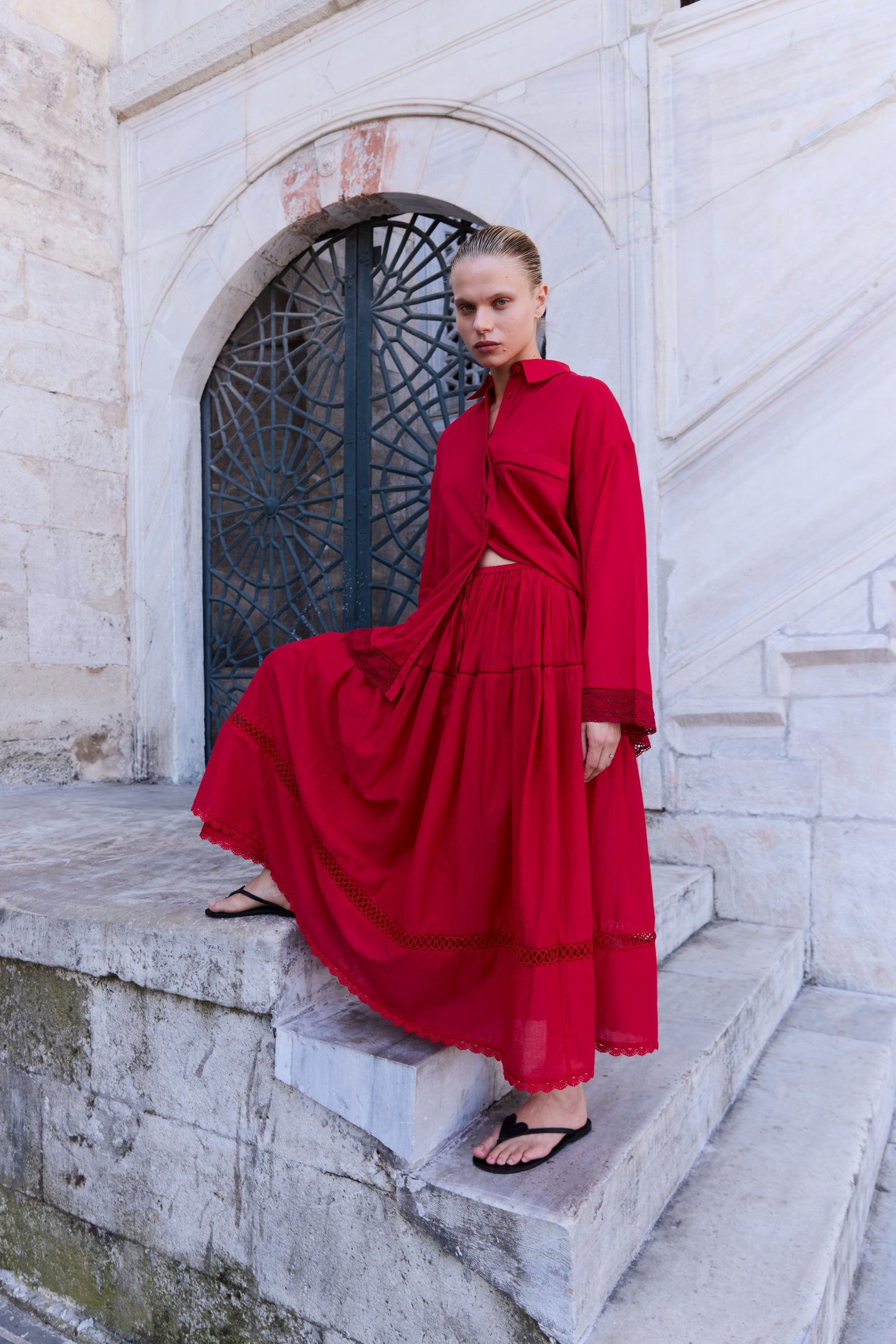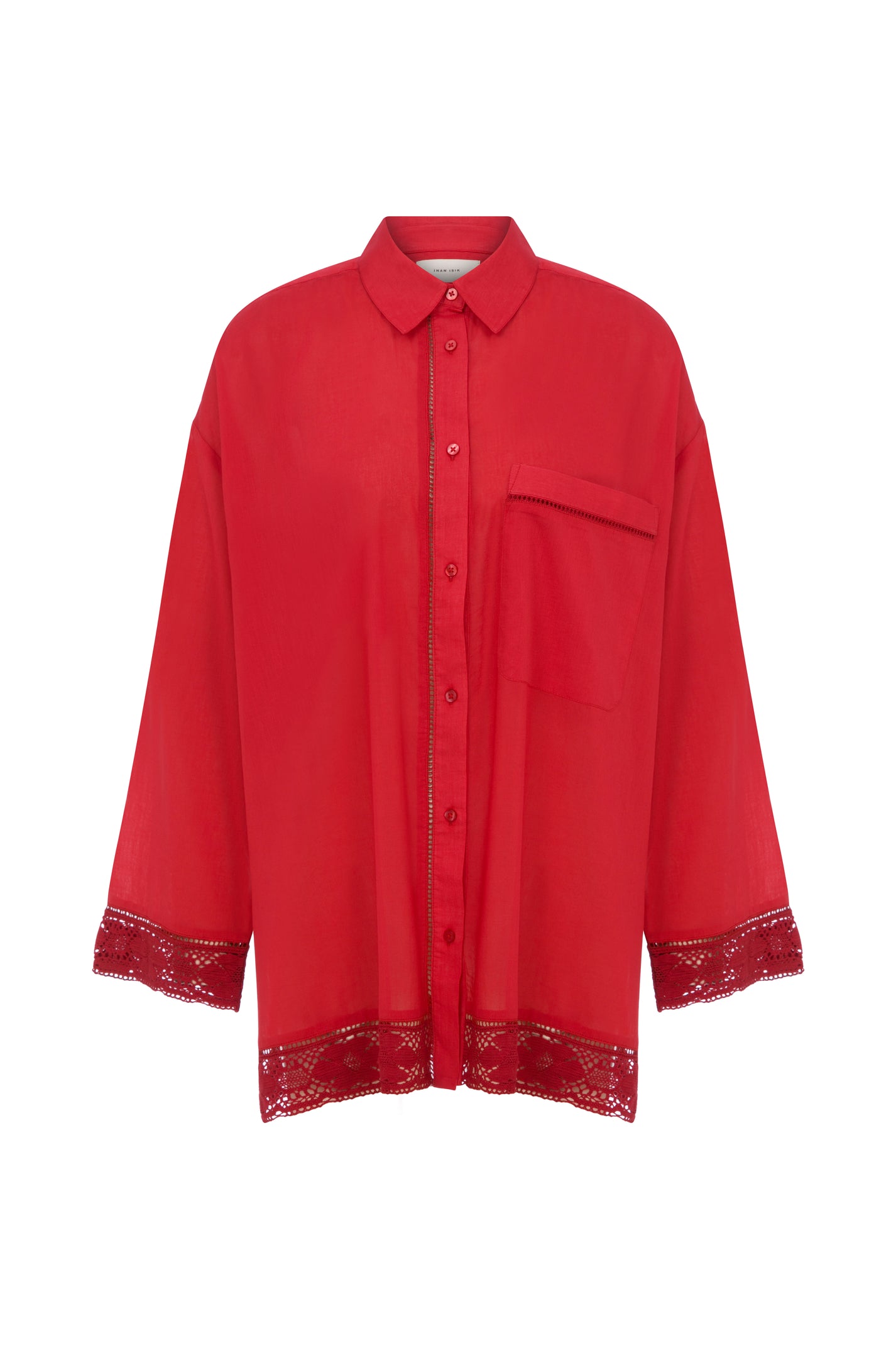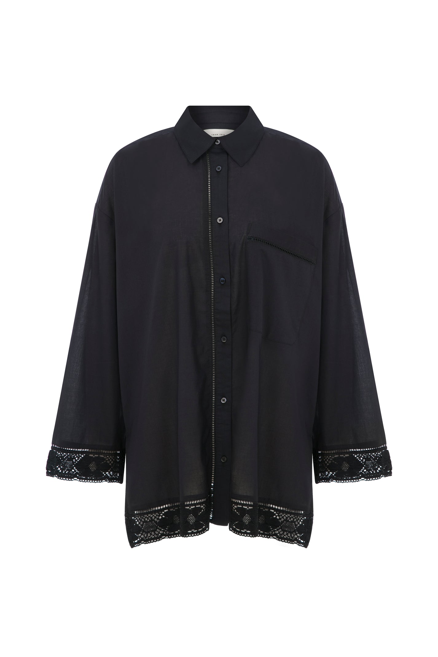 Delivery Month: March 2026 Pre-order deadline: 05.09.2025 / Oversized cotton voile shirt with lace trim. Features a chest pocket, exposed button placket, and side slits for ease. Lightweight and semi-sheer with a relaxed drape.