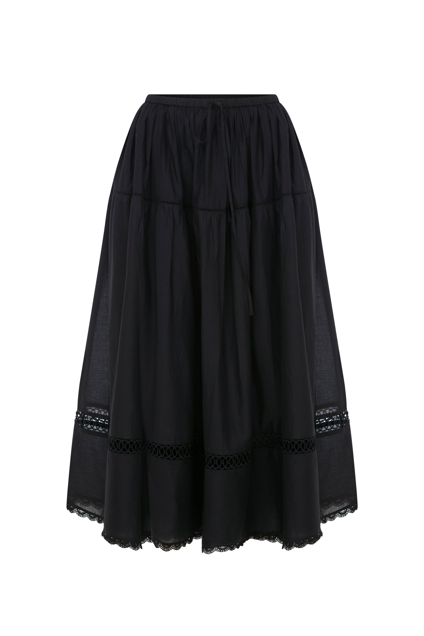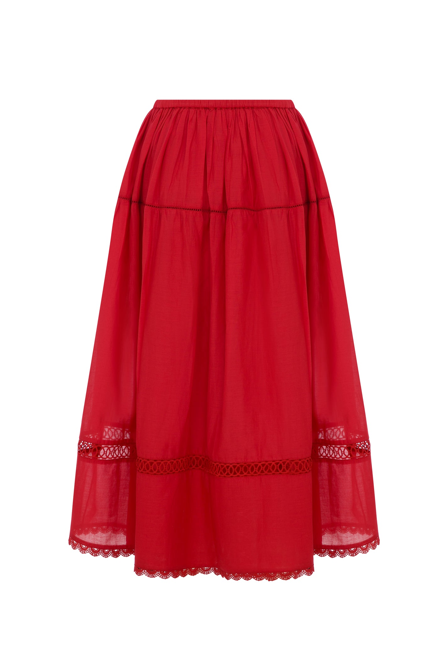 Delivery Month: March 2026 Pre-order deadline: 05.09.2025 / This ankle-length skirt is crafted from 100% lightweight cotton and features delicate lace trim detailing along the hem and panels. It is fully lined with a matching cotton layer that mirrors the lace trim design of the outer skirt, ensuring both comfort and a cohesive, refined finish. The elastic waistband allows for an easy slip-on fit.