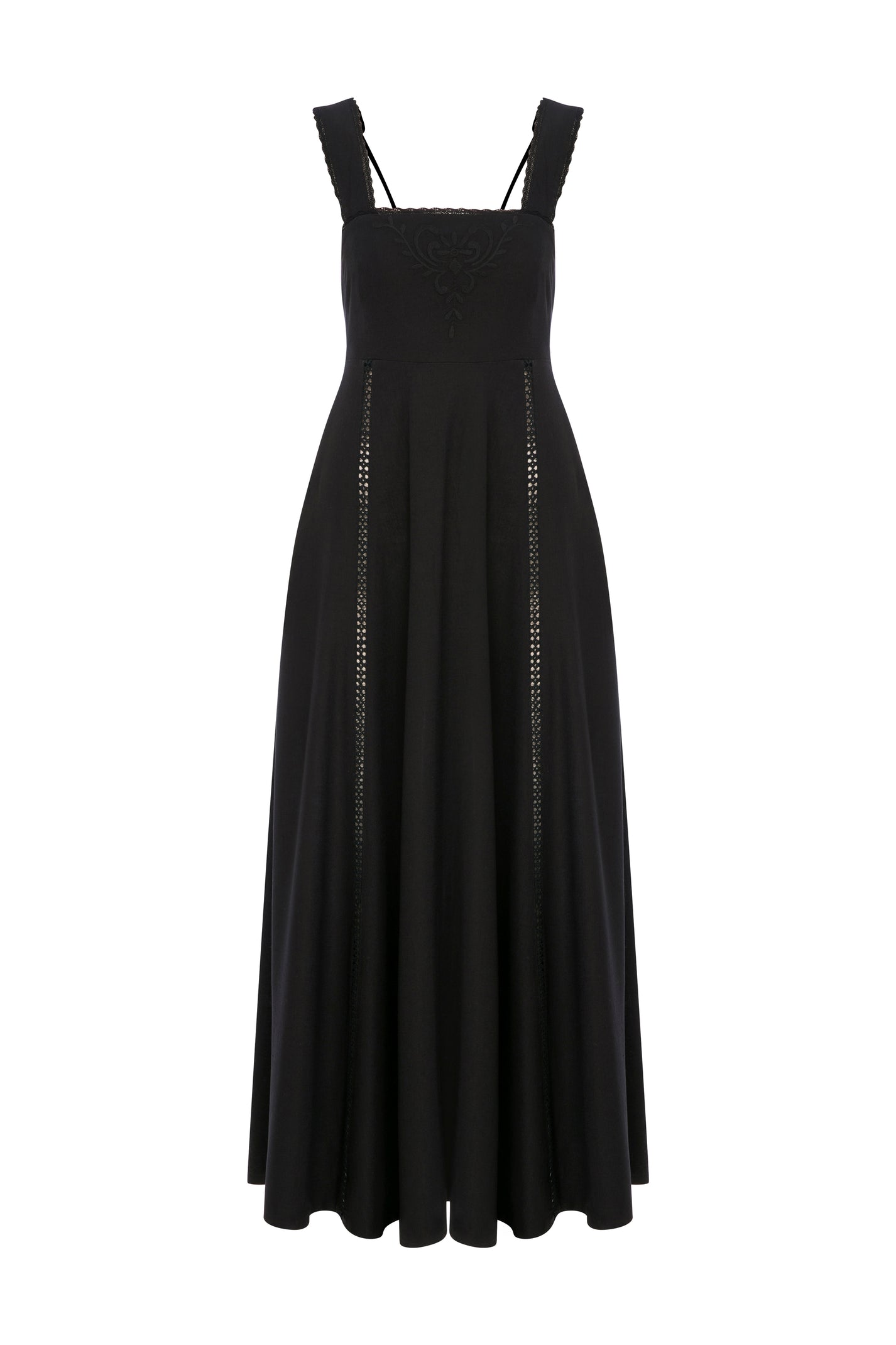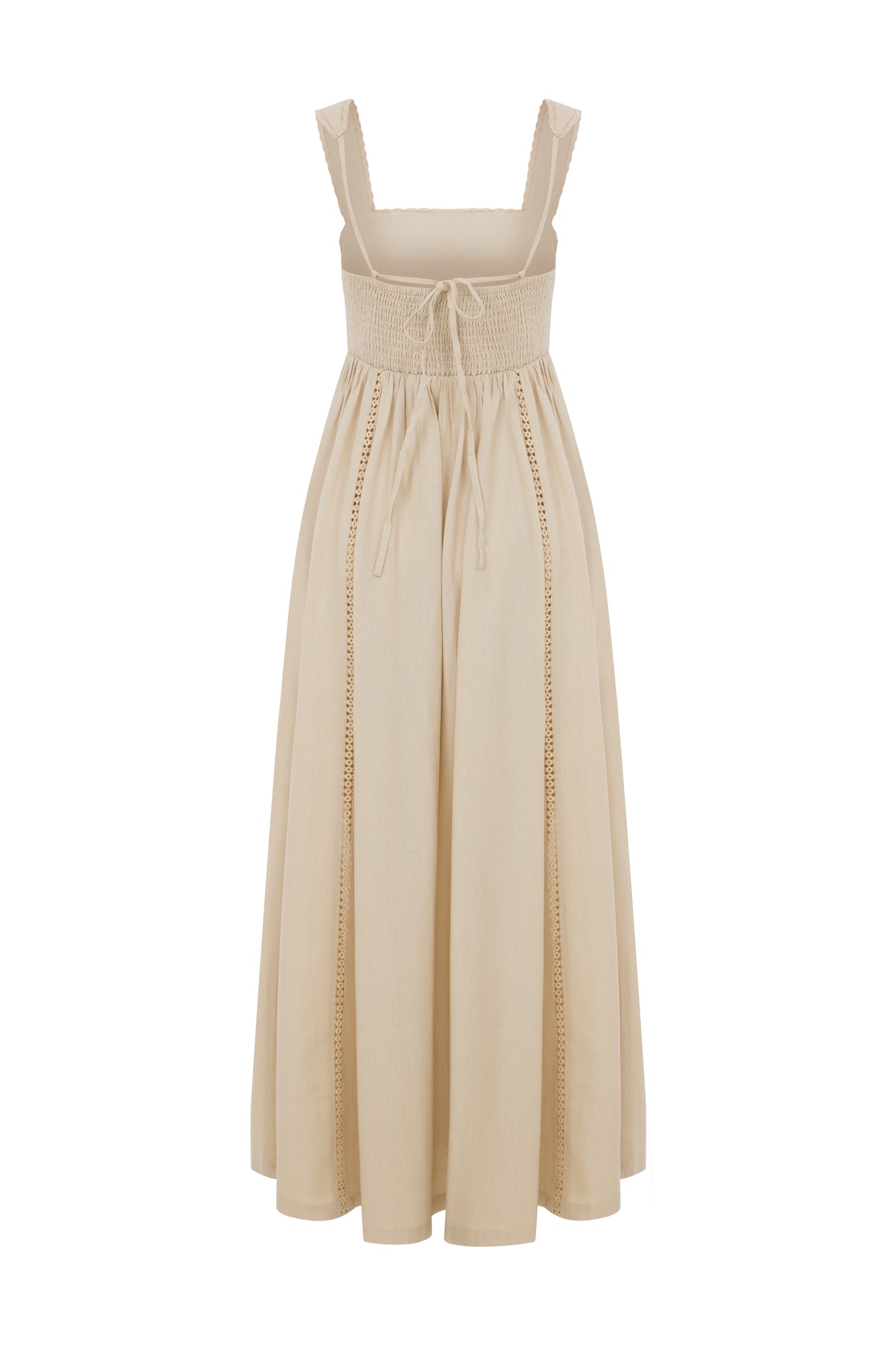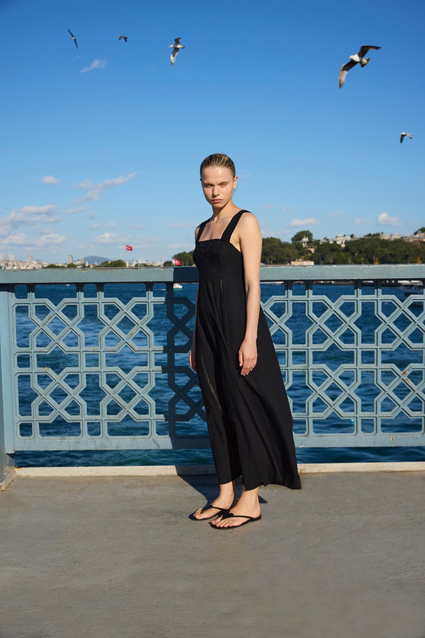 Delivery Month: March 2026 Pre-order deadline: 05.09.2025 / Sleeveless viscose dress with a square neckline and tonal embroidery at the bodice. Features wide lace-trimmed straps, ladder lace inserts, and a softly flared skirt. Smocked back for added comfort and ease.