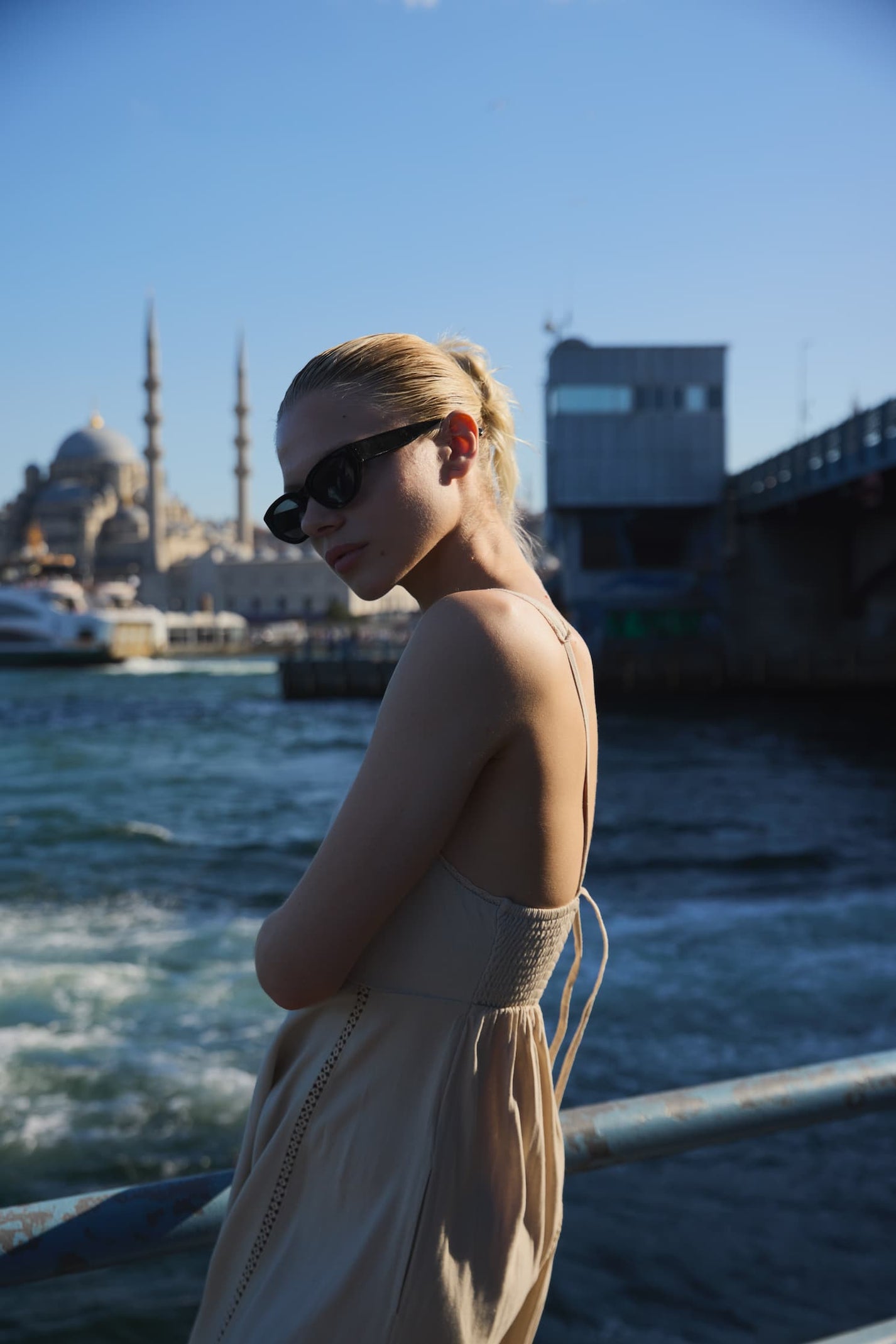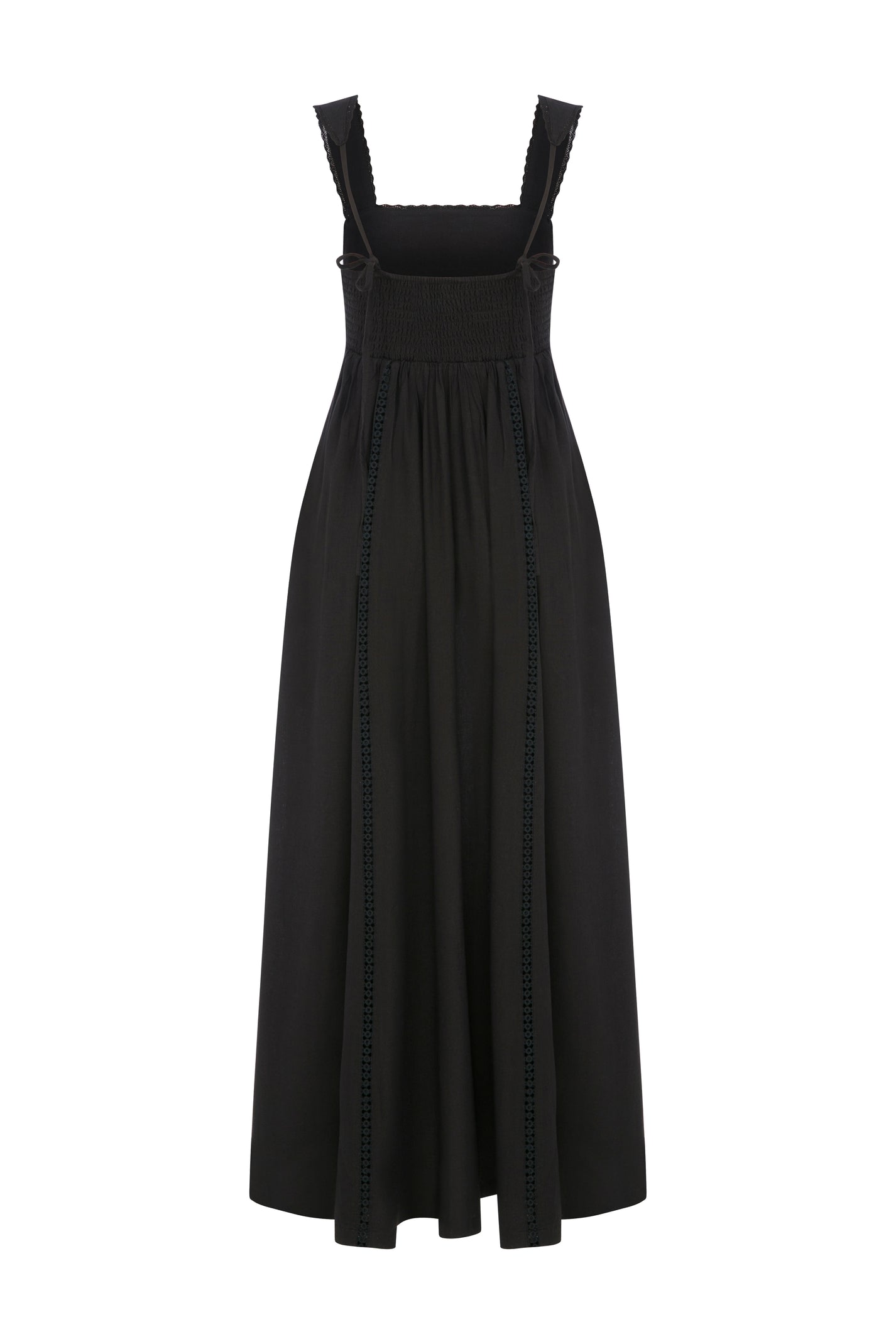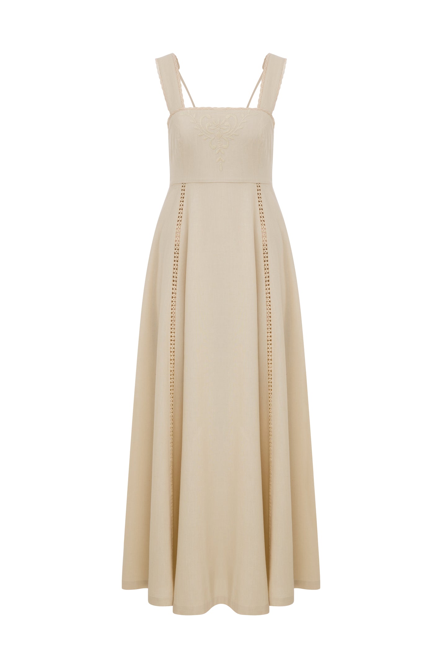 Delivery Month: March 2026 Pre-order deadline: 05.09.2025 / Sleeveless viscose dress with a square neckline and tonal embroidery at the bodice. Features wide lace-trimmed straps, ladder lace inserts, and a softly flared skirt. Smocked back for added comfort and ease.