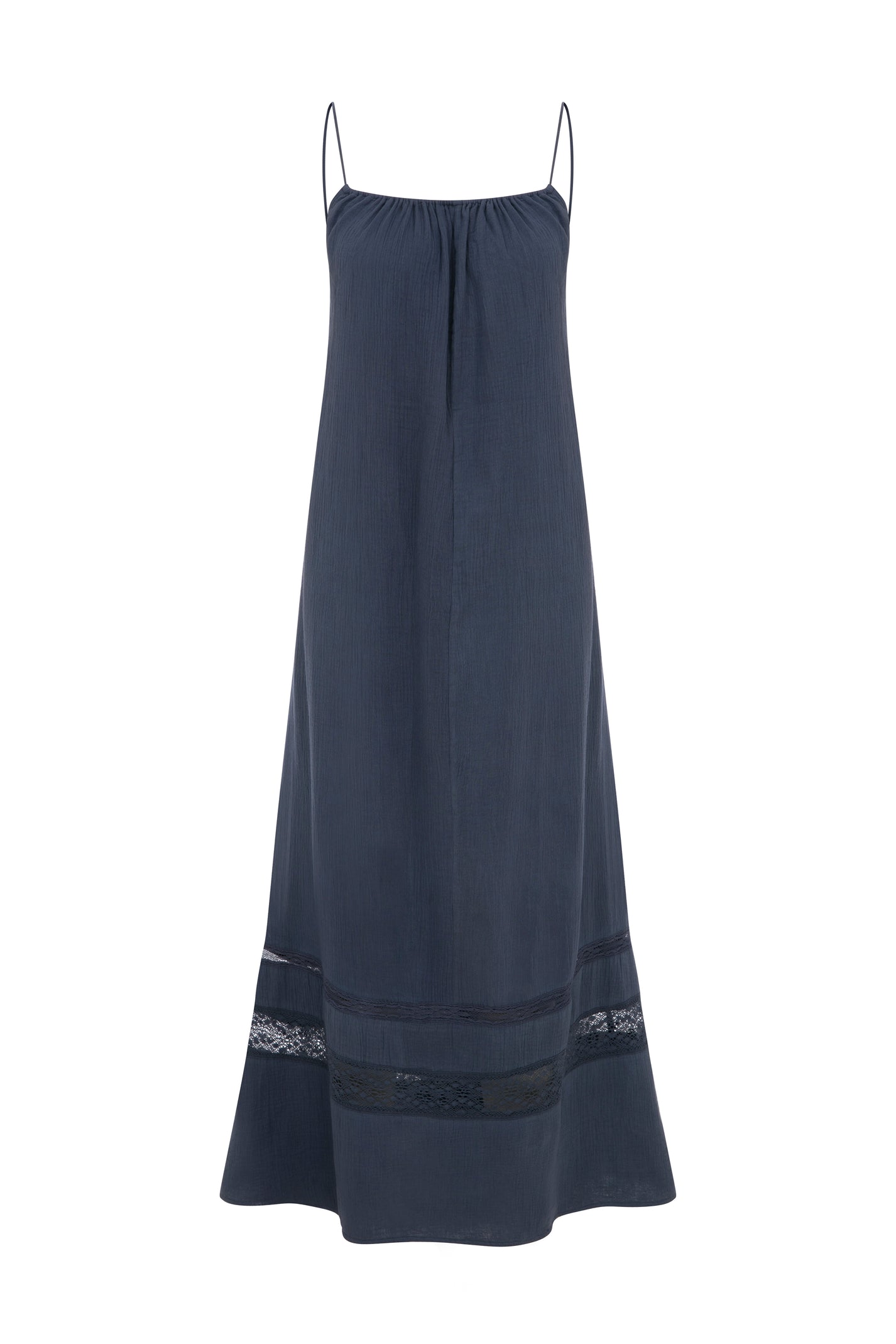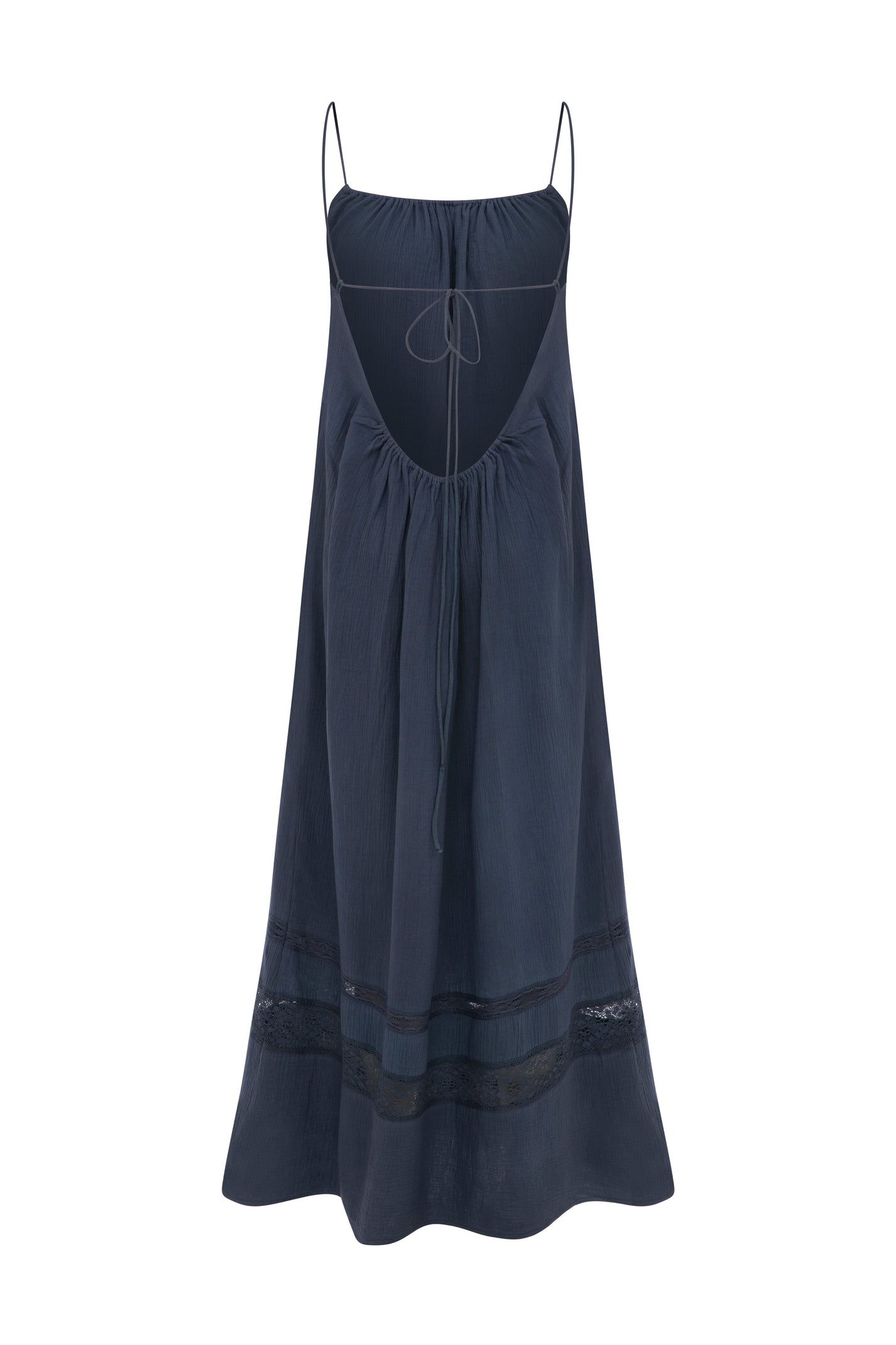 Delivery Month: March 2026 Pre-order deadline: 05.09.2025 / Crafted from airy cotton gauze, the Olina Dress features a flowing silhouette with delicate lace panels and barely-there straps. An open back with fine tie details adds a refined touch. Timeless, effortless, and quietly sensual.