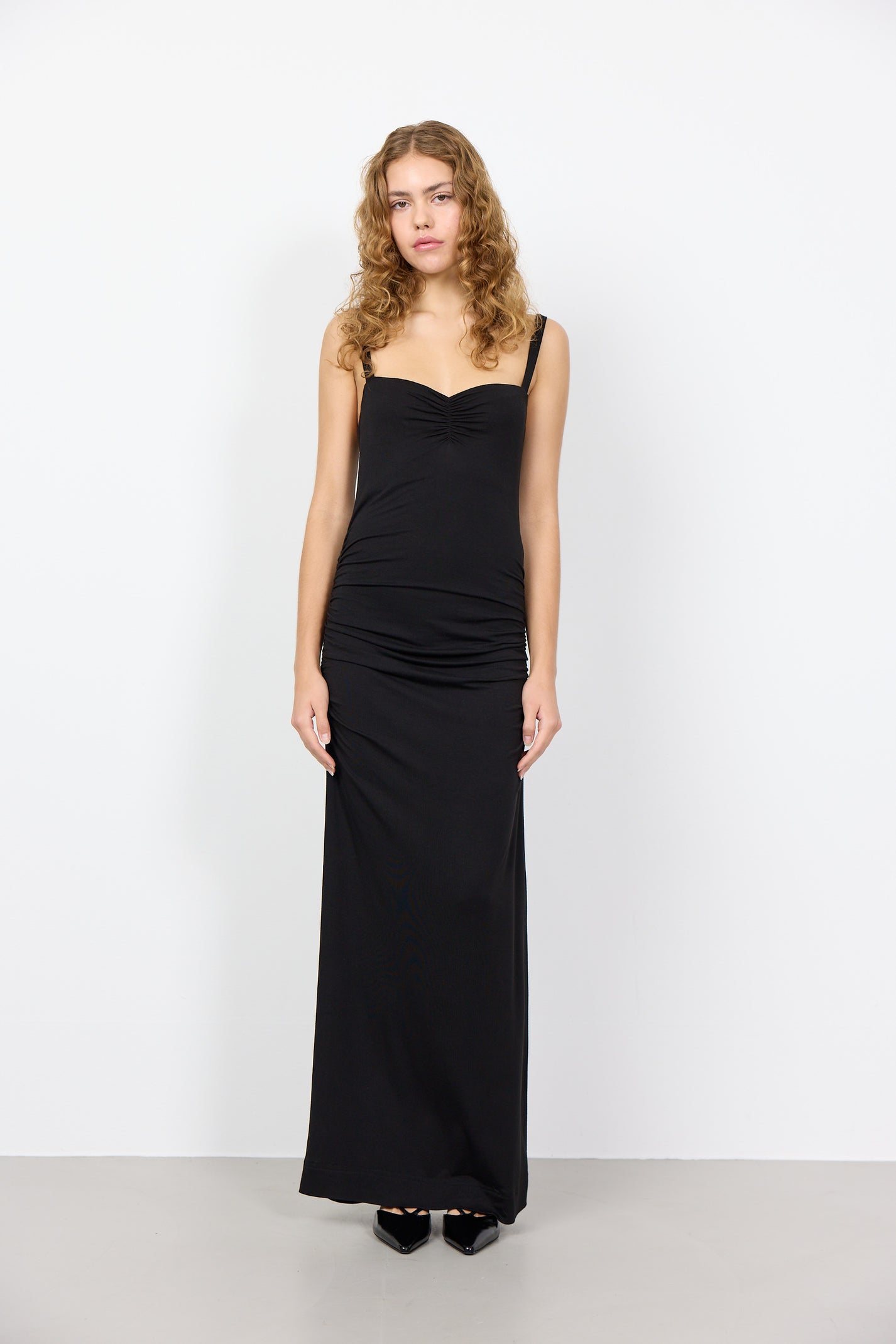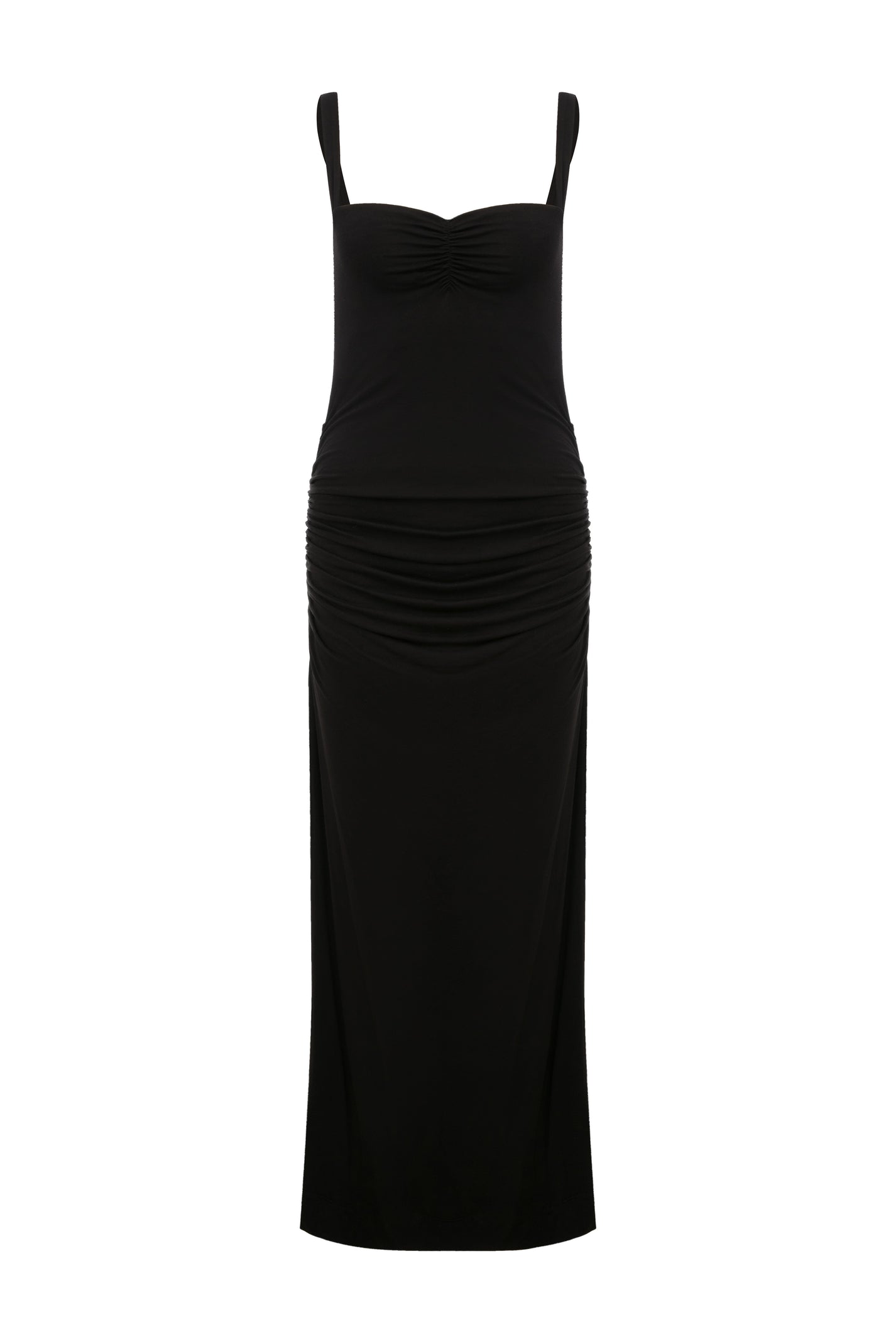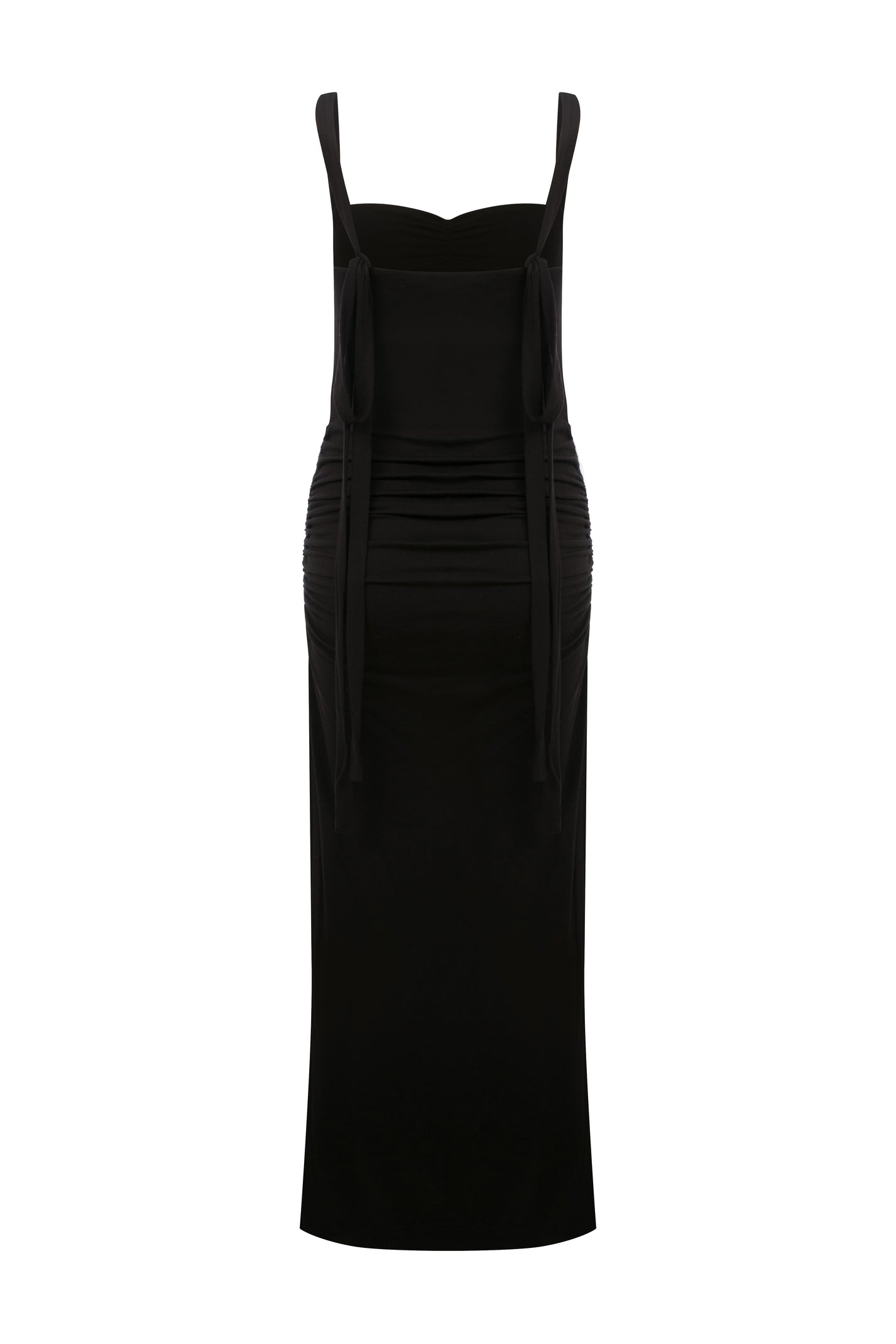 Maxi-length dress in stretch viscose jersey. Features ruched front detail, adjustable tie straps, and a straight hem. Slim fit with slight draping.